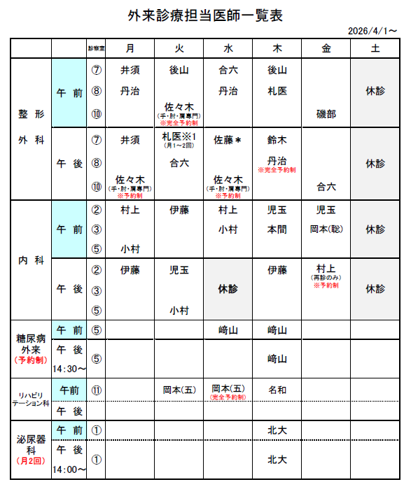 2026年4月1日からの外来担当医師表